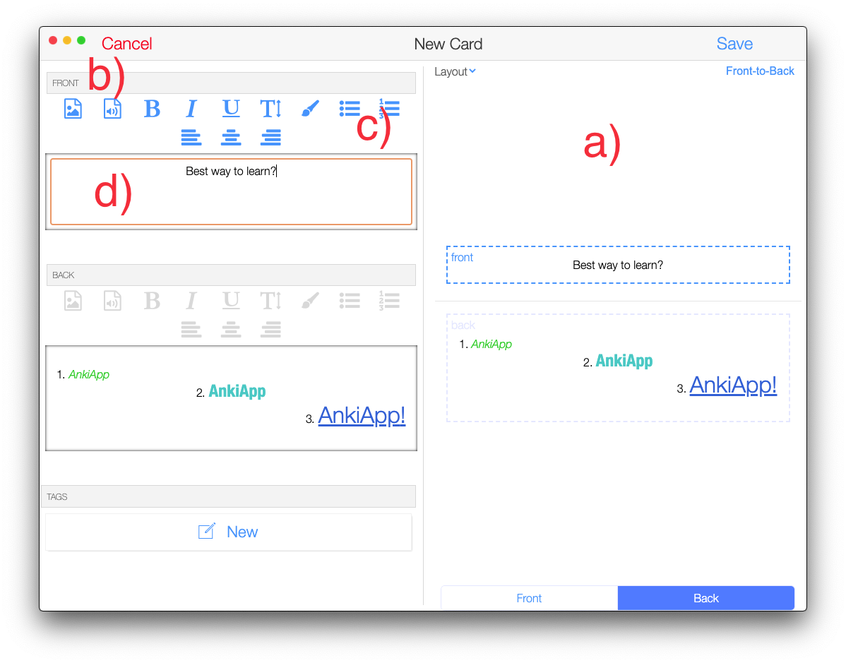 AnkiApp gives you powerful features for creating cards. The screenshot below highlights the important parts of the card creation interface.